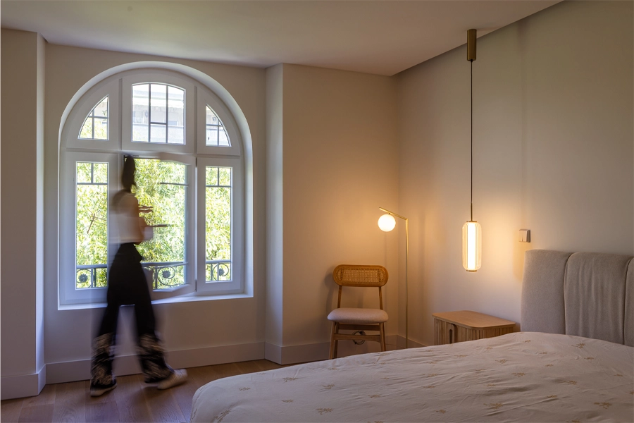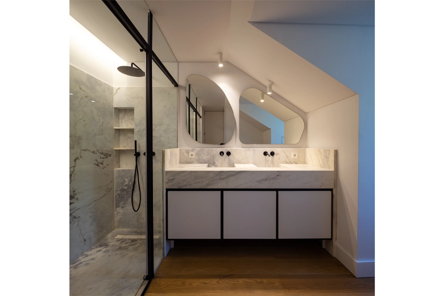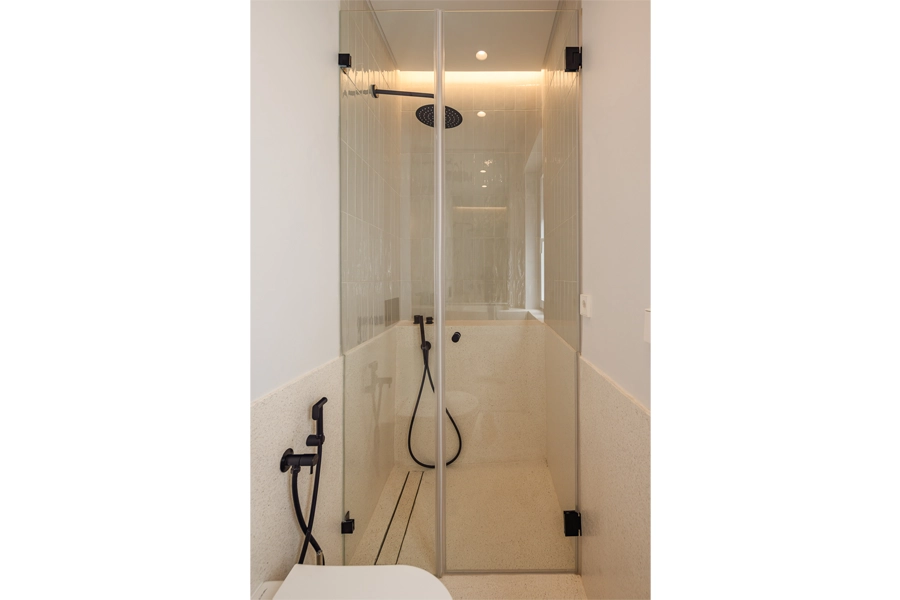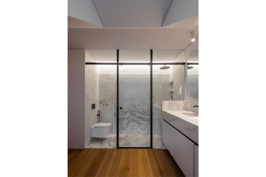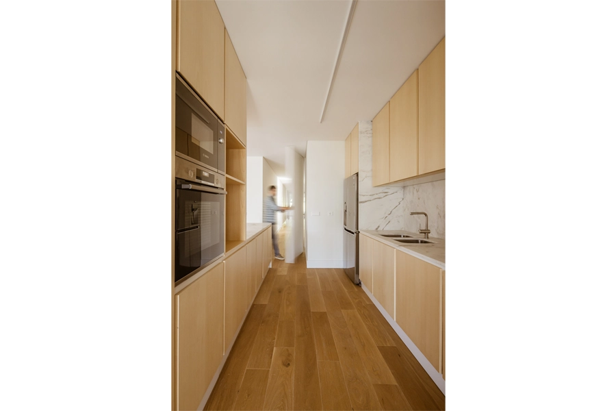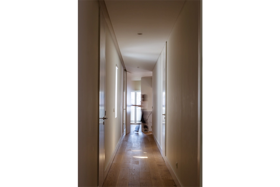 Mantendo a implantação original, mesmo com o acrescento ilegal da cozinha, dividiu-se a casa em 2 partes, ficando a área social no piso de baixo e os quartos no piso superior e sótão, tudo ligado por uma caixa de escadas contínua, formando um triplo pé-direito a terminar no tecto inclinado do último piso.